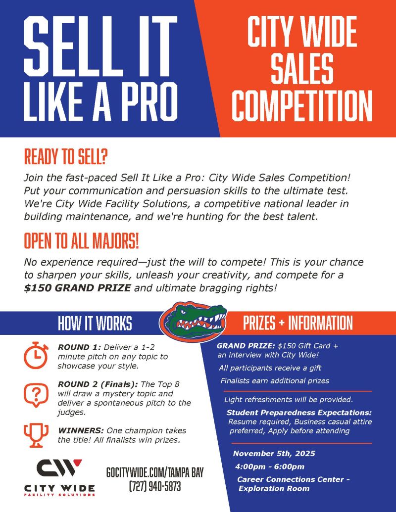 Think you’ve got what it takes to sell anything? Put your skills to the test in the Sell It Like a Pro: City Wide Sales Competition — a fast-paced, high-energy sales competition where your communication and persuasion skills take center stage! We are a competitive sales organization and we’re excited to see what the next generation of young professionals from the University of Florida have to offer.