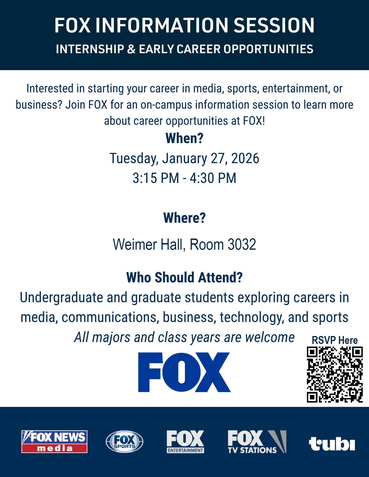 Interested in starting your career in media, sports, entertainment, or business? Join FOX for an on-campus information session to learn more about career opportunities at FOX!