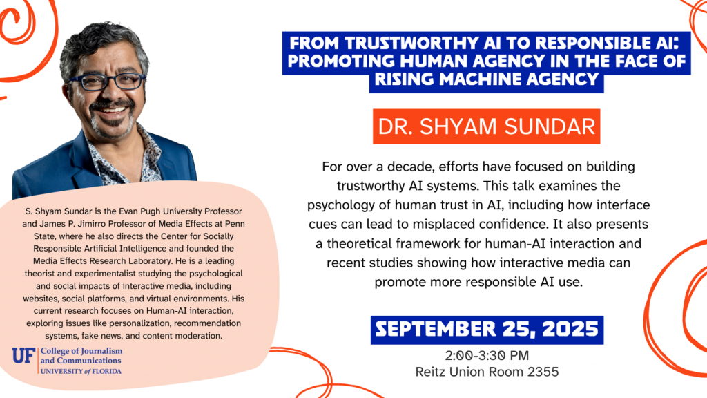 S. Shyam Sundar (Ph.D., Stanford University) is Evan Pugh University Professor and James P. Jimirro Professor of Media Effects and Director of the Center for Socially Responsible Artificial Intelligence (CSRAI) at Penn State University. He is also the founding director of the Media Effects Research Laboratory at Penn State University’s College of Communications. Prof. Sundar is a theorist as well as an experimentalist who uses a variety of quantitative and qualitative approaches in his research. His research examines social and psychological effects of interactive media, ranging from websites and social media to virtual assistants and virtual environments. Specifically, his experiments investigate the role played by technological affordances in shaping user experience of mediated communications. Current research pertains to psychological effects of Human-AI interaction in a variety of contexts, ranging from personalization and recommendation to fake news and content moderation. He edited the Handbook of the Psychology of Communication Technology (2015) and served as editor of the Journal of Computer-Mediated Communication (2013-2017).