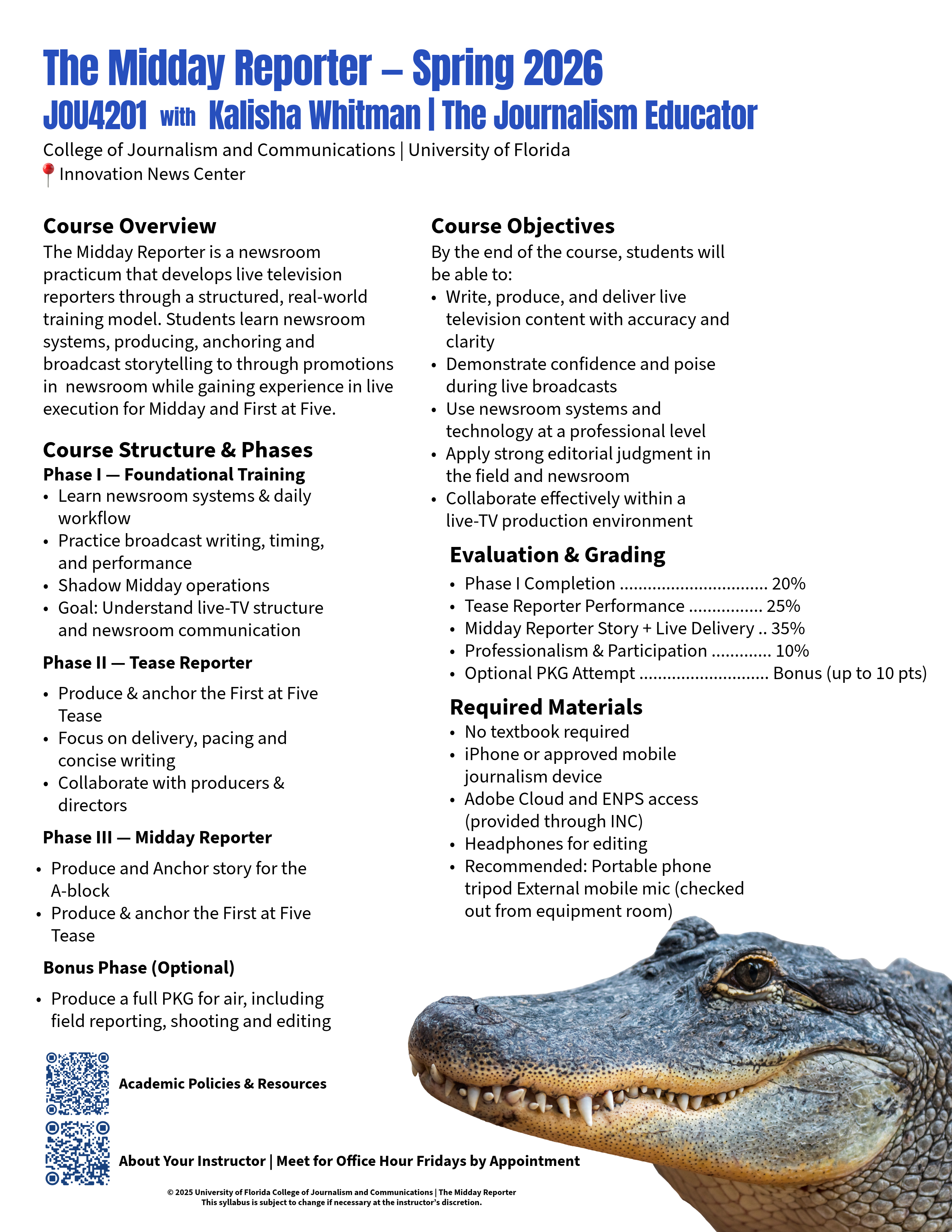 Kalisha Whitman is who you want at the helm. She is an Emmy® award-winning journalist who understands how to captivate audiences through media. She coaches individuals at the University of Florida to create and produce engaging non-perishable content through her motivating, futuristic and deliberate methods.
